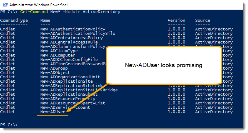 First, let’s check out what commands are available for Active Directory with PowerShell. I’m going to narrow it down to all the Active Directory cmdlets that start with the word New- (since we want to create new users):