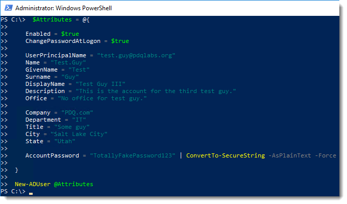 New-ADUser @AttributesOnce again, no news is good news. As mentioned above, the @Attributes is using a technique known as splatting, which uses a hash table to pass named parameters. Our $Attributes variable is being defined as a hash table in this example.