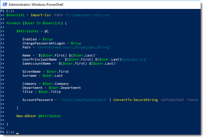 With that, here’s one final example importing the csv (Import-Csv), integrating a loop and .csv file. (Please note that if you’re specifying a different OU, you’ll need to use the DistinguishedName attribute.