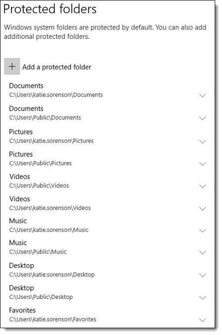 Controlled Folder Access is off by default. After enabling it, the list of default protected folders appears to be fairly innocuous. System folders, as well as current logged on and public user directories are protected. This, however, cannot be changed, even by PowerShell or group policy.
