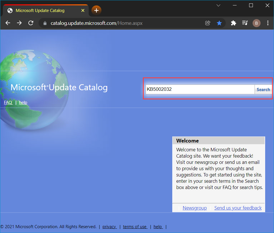 1. Head over to the Microsoft Update Catalog, enter the KB number into the search field, and click Search. Again we're using KB5002032 for this example.