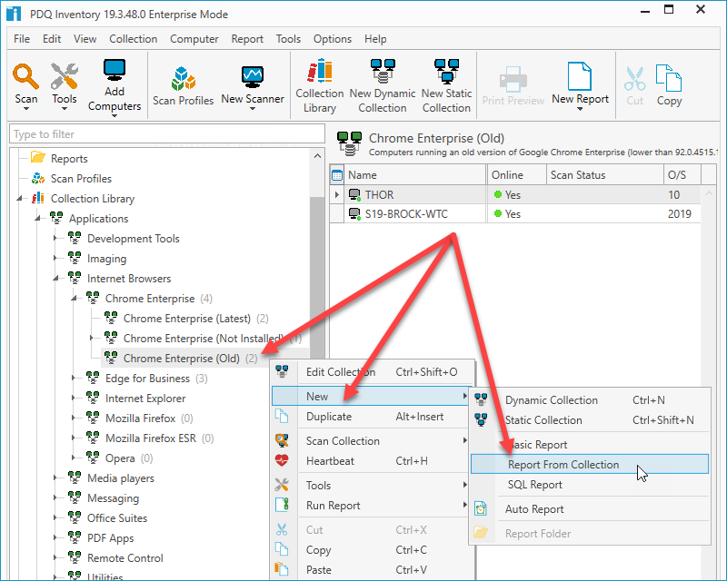 Right-click on a collection and select New > Report From Collection. In this example, I'll use the Chrome Enterprise (Old) collection from the Collection Library.