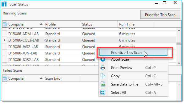 3. Right-click the highlighted computers and select Prioritize This Scan.