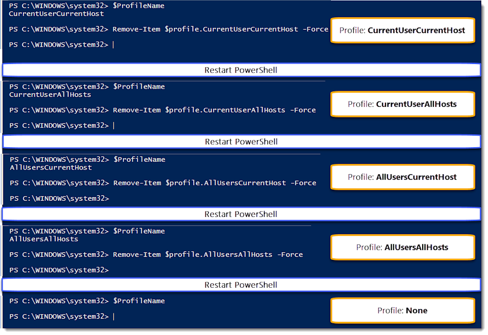 Moving backward, we can test the remaining order. We’ll have to remove profiles and restart PowerShell as we go along. I did them all in order so that it’s easy to see. Plus, I made it one combined screenshot.