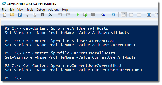 This means the AllUsersAllHosts profile is loaded first and the CurrentUserCurrentHost profile is loaded last. Just remember the current host refers to whatever application you’re using to interact with PowerShell — PowerShell console, PowerShell ISE, Visual Studio Code, etc.
