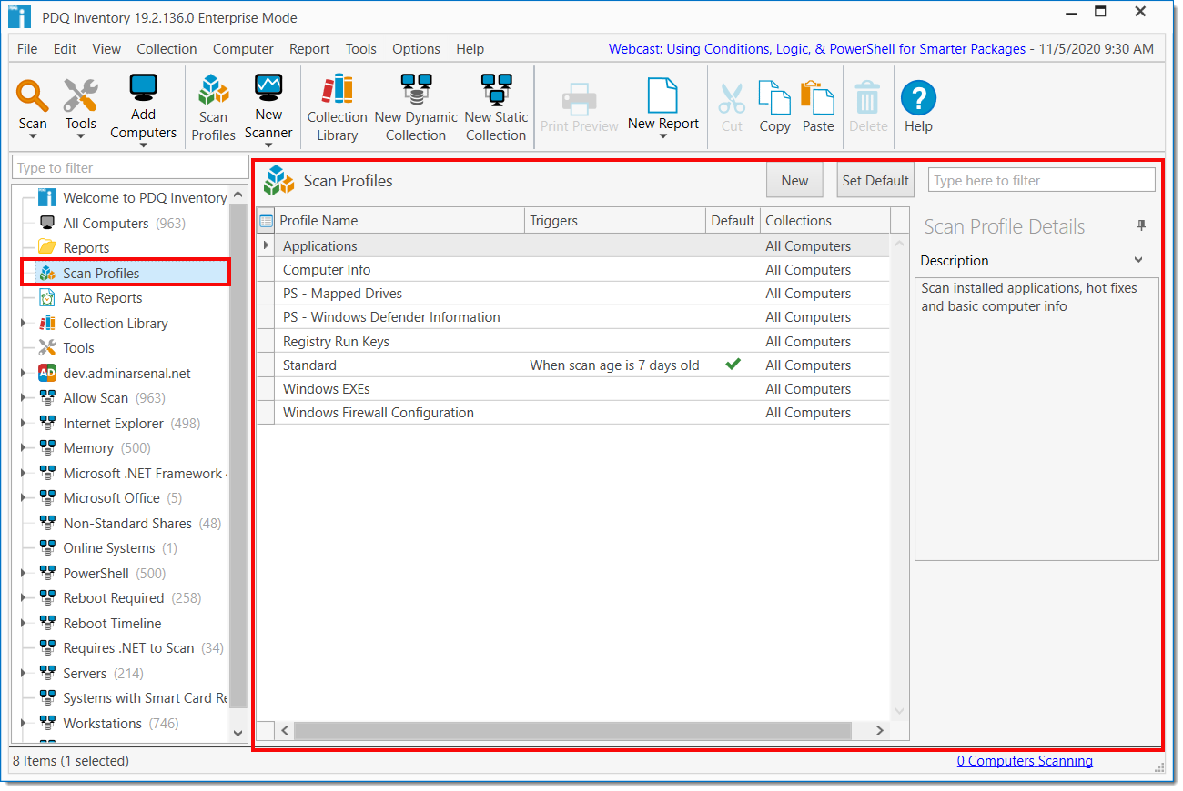 Inventory: Scan Profiles window moved to a page in the main console tree.
