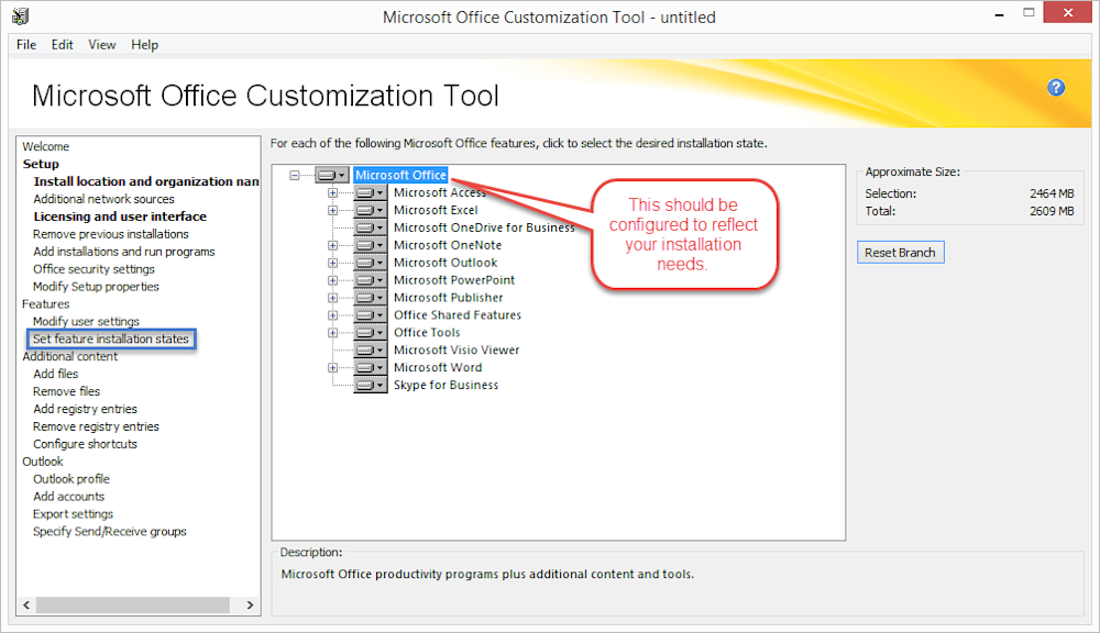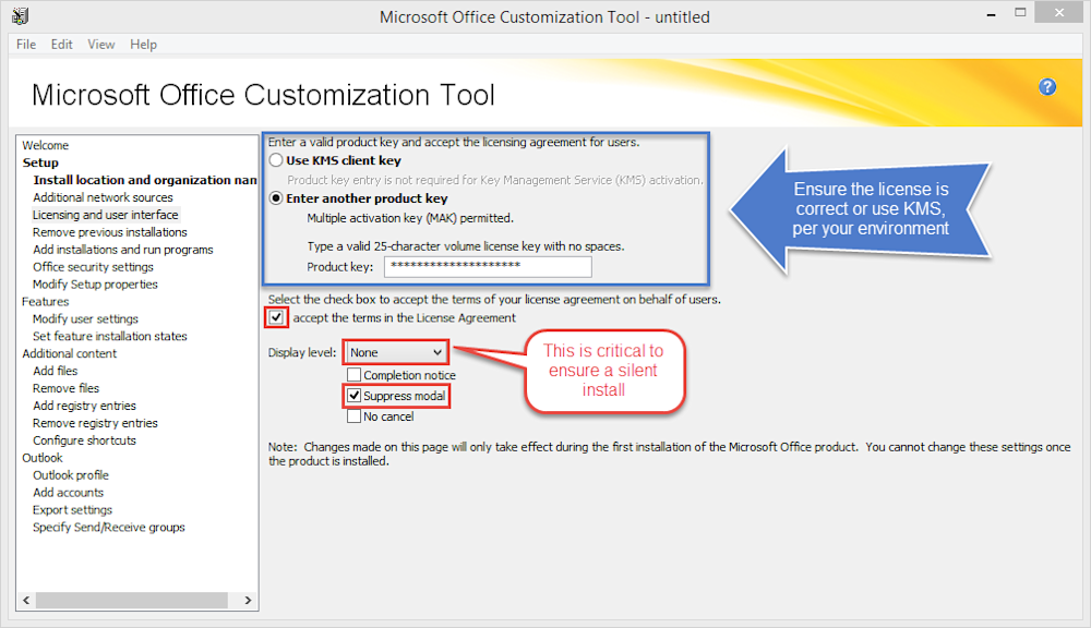 Drag the setup.exe to Start > Run, and append /admin to the setup.exe path to open the OCT (c:\path\to\Officefiles\setup.exe /admin) . Once you have the OCT open, you’re ready to customize your Office installation. Give it a good look over, but for sake of time/interest, here are the basic customizations you’ll need to make to install this silently.