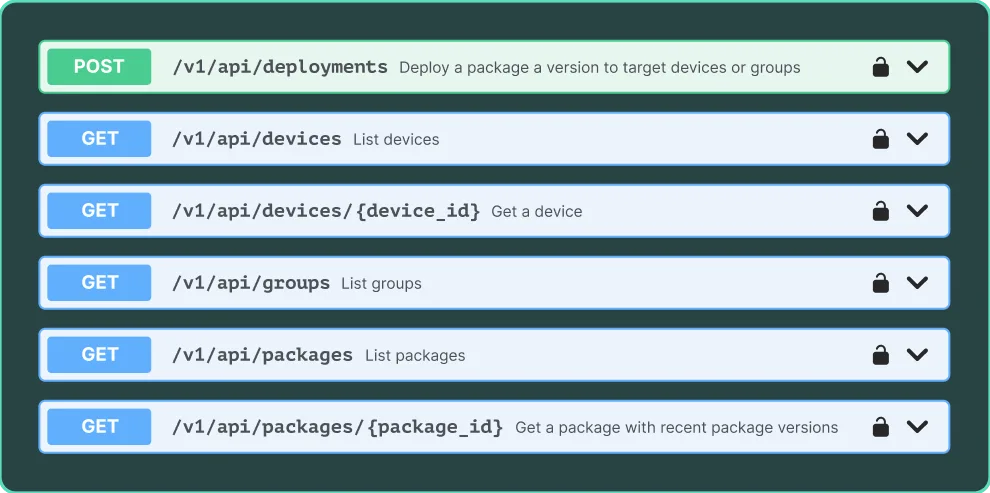 Create custom integrations so you can deploy a package, surface inventory information, and more from elsewhere in your tech stack with PDQ Connect’s secure RESTful API.
